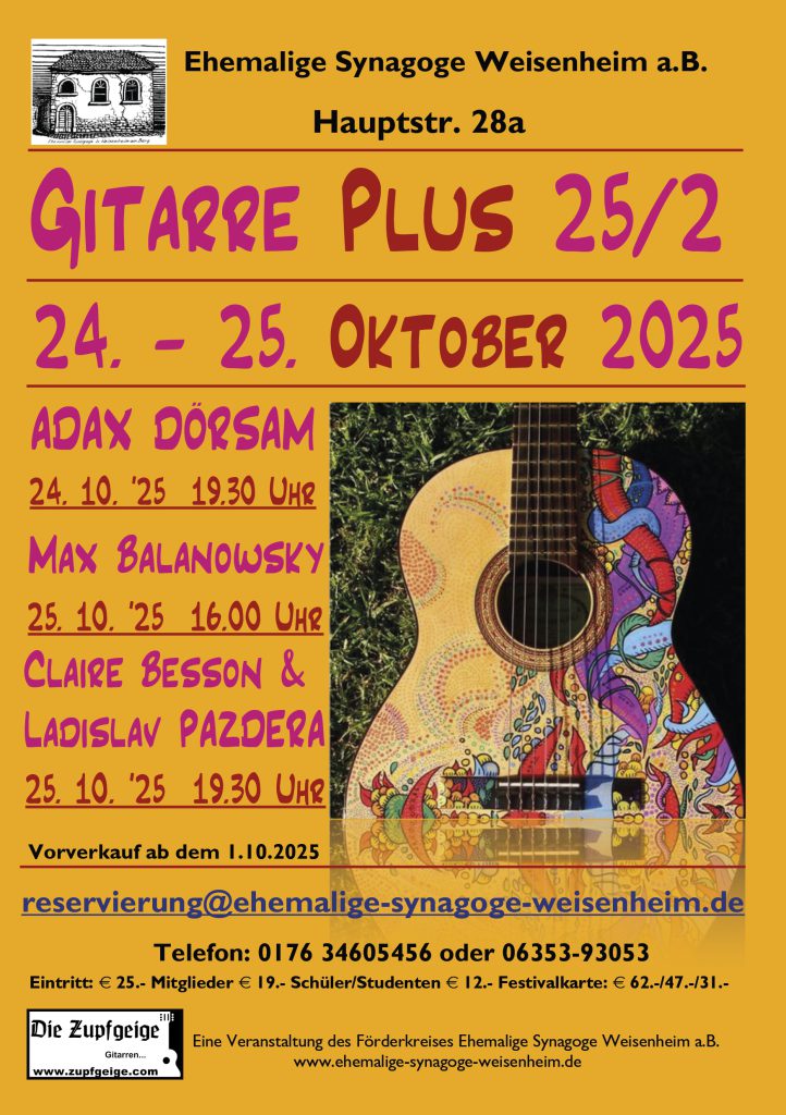 Wie jedes Jahr im Herbst findet in der edlen Akustik der Ehemaligen Synagoge Weisenheim a.B. das Festival GITARRE PLUS 25/2 statt. Der Förderkreis der ehemaligen Synagoge freut sich über zahlreiche Nachfrage.